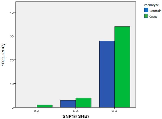 rs11031006 (FSHB): Patients with endometriosis did not have an increase in genotypic or allelic frequency for this polymorphism compared to the control group (p = 0.9999, OR = 0.000, 95% CI, 0.000–15.000 and p = 0.731, OR = 1639, 95% CI, 0.393–683, respectively, for heterozygous genotype GA and polymorphic minor allele A) (Table 5, Figure 1). We also verified whether, by stratifying the sample of cases based on the severity of the situation (considering only women with stage III and IV endometriosis), a possible association with the investigated polymorphism would emerge; however, no correlation was found.