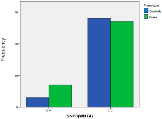 rs7521902 (WNT4): Patients with endometriosis did not have an increase in genotypic or allelic frequency of this polymorphism compared to the control group (p = 0.3088, OR = 0.4133, 95% CI, 0.10–1.8 and p = 0.3297, OR = 2257, 95% CI, 0.55–914, respectively, for heterozygous genotype CA and polymorphic minor allele A) (Table 7, Figure 3). No association was found between this SNP and the disease, even when limiting the analysis to the sample of severe surgical cases (stage III and IV).