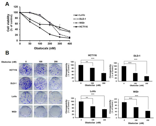 2.1. Obatoclax Is Cytotoxic and Proapoptotic against Multiple Human Colorectal Carcinoma Cell Lines