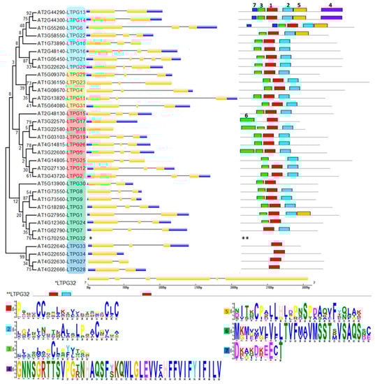 The phylogenetic tree grouped LTPg proteins into four clusters. Group 1 was the biggest group that comprised 14 proteins and was divided into two subgroups with 9 and 5 proteins in the first and second subgroup, respectively. Most of the group members demonstrated a similar pattern of three exons and two introns in the gene structure with a few exceptions. For instance, LTPg13 (At2g44290) and LTPg14 (At2g44300) are tandem duplicates with only two exons and a single intron, while LTPg16 and LTPg21 display four and five exons with three and four introns, respectively. Substantial similarity was observed in the proteins of group 1 in terms of conserved motifs. All the proteins in this group possessed motif 1, 2, and 3. In addition, LTPg13, LTPg14, LTPg6, and LTPg22 had motif 5, while motif 7 was only characteristic of LTPg13, LTPg14, and LTPg6, where LTPg6 contained motif 7 twice. LTPg13 and LTPg14 are the only LTPgs that have motif 4 containing a large number of aromatic residues at the C-terminus.