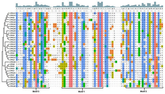 The conserved motifs analysis through MEME Suite identified a total of seven different motifs, with motif 1, 2, and 3 found in the majority of the 34 LTPg proteins occurring 34, 27, and 27 times, respectively. These motifs correspond to the LTP domain containing six of the eight cysteine residues. Motif 1 was present in all the LTPg proteins except LTPg25 while being present twice in LTPg32. The sequence logos of different motifs clearly displayed a conservation of cysteine residues among the first three motifs (Figure 2). Cysteine was also highly conserved in motif 5 but to a lesser extent in motif 6 and 7. LTPg5 protein contained eight cysteine resides, which is an attribute of antimicrobial peptides. Multiple sequence alignment of the most conserved region of the LTPg proteins (motifs 3, 1, and 2) showed a high extent of sequence similarly (Figure 3).