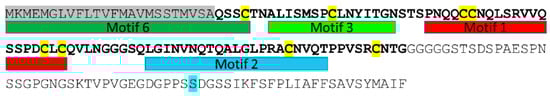 Sequence of LTPg5 protein, including the identified motifs. Signal peptide is shown in grey and the sequence corresponding to the nsLTP is in bold. Cysteine residues are marked yellow. Motifs are shown below the sequence. The GPI anchor is attached at amino acid 146 (S, marked blue).