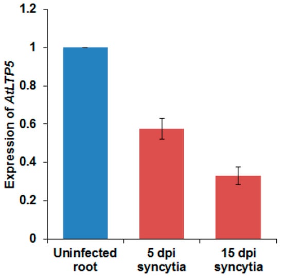 Expression of LTPg5 in response to nematode infection in 5 and 15 dpi syncytia using quantitative real time PCR (qRT-PCR). The data included three independent biological replicates. The values are means ± SE, n = 3.