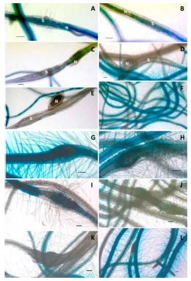 Promoter::GUS analysis of LTPg5 in syncytia and galls induced by H. schachtii and M. incognita, respectively, at different time points. (A–F) represent GUS staining in 3, 5, 10, 12, and 15 dpi syncytia and uninfected roots, respectively, where N = nematode and S = syncytia. Similarly, (G–L) represent GUS staining in 3, 5, 10, 12, and 15 dpi galls and uninfected roots, respectively. Scale bar = 100 µm.