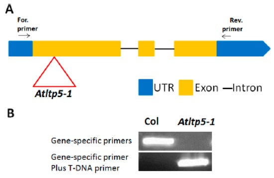 Knock-out mutant for LTPg5, (A) The T-DNA insertion (inverted triangle) in ltp5-1 (SAIL_329_H03) (B) PCR with DNA from homozygous mutant and Columbia (Col).