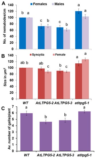 Nematode resistance test. The resistance of overexpression lines and a knock-out mutant of LTPg5 was compared to wild type plants after infection with nematodes. (A,B) Infection with H. schachtii, (A) The number of male and female nemaodes per cm of root length calculated at 15 dpi setting the wild type as 100%. The infection rate is shown in column sets with different letters indicating significant differences (p < 0.05; ANOVA and LSD). The statistical significance was determined by three independent replicates for female and male nematodes separately. The values are means ± SE, n = 15. The bar shows standard error for the mean. (B) The size of female syncytia and female nematodes at 14 dpi. Eight syncytia were selected randomly from three independent replicates (total = 24), and the size of syncytia and associated female nematodes were determined. (C) M. incognita resistance test. The resistance of two overexpression lines of LTPg5 was compared to wild type plants after infection with M. incognita. The number of galls per roots were counted at 15 dpi. The number of galls given in column sets with different letters indicate significant differences (p < 0.05; ANOVA and LSD). The statistical significance was determined by three independent replicates. Values are means ± SE, n = 12.
