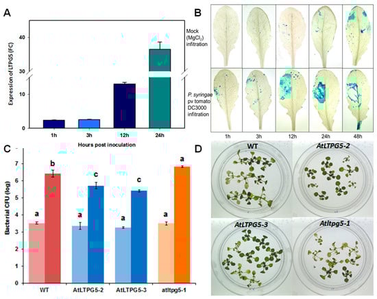 Expression and functional analysis of LTPg5 in response to P. syringae pv tomato DC3000. (A) The expression of LTPg5 in wild type plants in response to P. syringae pv tomato DC3000 was determined by qRT-PCR. The data included three independent biological and three technical replicates. The values are means ± SE, n = 3. The bar shows the standard error for the mean. (B) The GUS staining of rosette leaves of a promoter LTPg5::GUS line after mock infiltration (MgCl2) and infiltration with P. syringae pv tomato DC3000 at different time points. (C) The overexpression lines, mutant, and wild type control were infected in plates by flooding according to []. The data were analysed for significance difference using ANOVA (p < 0.05) and LSD. The values are means ± SE. The light bars show mean CFU (colony forming units) at 1 hpi (hours after infection), while dark bars show mean CFU 72 hpi. (D) the overexpression lines showed less chlorosis and necrosis at 3 dpi as compared to Columbia wild type and mutant.