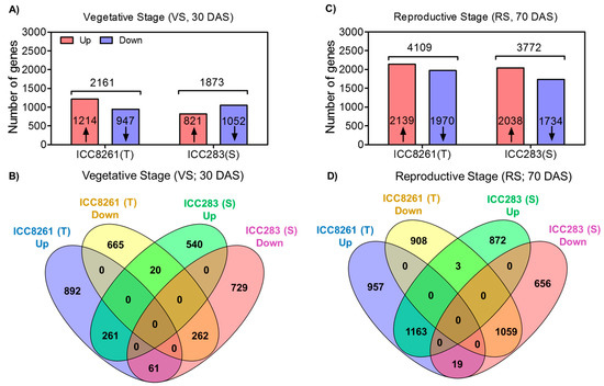 Bar graphs and Venn diagram representing genotype- and developmental stage-specific differentially expressed genes (DEGs) in response to drought stress. (A) DEGs up- and down-regulated in the tolerant (T, ICC8261) and sensitive (S, ICC283) genotypes at the vegetative stage (VS); (B) Venn diagram showing commonly up- and down-regulated DEGs amongst the genotypes at the vegetative stage (VS); (C) DEGs up- and down-regulated in the tolerant (T, ICC8261) and sensitive (S, ICC283) genotypes at the reproductive stage (RS); (D) Venn diagram showing commonly up- and down-regulated DEGs amongst the genotypes at the reproductive stage (RS).