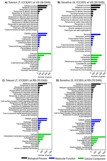 Genotype- and developmental stage-specific enrichment of gene ontology (GO) terms in (A) tolerant (T, ICC8261) genotype at vegetative stage (VS) (B) sensitive (S, ICC283) genotype at vegetative stage (VS) (C) tolerant (T, ICC8251) genotype at reproductive stage (RS) and (D) sensitive (S, ICC283) genotype at reproductive stage (RS).