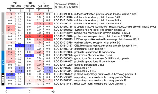 Heat map illustrating differential expression of various protein kinases (PK), detoxification enzymes (DET) and respiratory burst oxidases (RBOH) in the tolerant (T, ICC8261) and sensitive genotype (S, ICC283) at vegetative (VS), reproductive transition (RTS) and reproductive (RS) stages. The scale color represents log2 fold change.