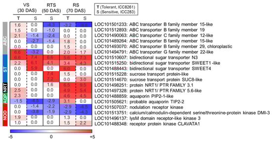Heatmap illustrating differential expression of various transporters and root-nodule development genes that include ABC-transporters (ABC), sugar transporters (ST), NRT1/PTR transporter family (NRT1/PTR), aquaporins (AQP) and nodulation related genes (NOD) in the tolerant (T, ICC8261) and sensitive genotype (S, ICC283) at vegetative (VS), reproductive transition (RTS) and reproductive (RS) stages. The scale color represents log2 fold change.