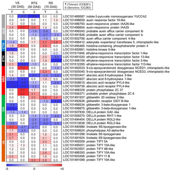 Heatmap illustrating differential regulation of auxin (AUX), cytokinin (CK), ethylene (ETH), abscisic acid (ABA), gibberellic acid (GA)and jasmonic acid (JA) related genes in the tolerant (T, ICC8261) and sensitive genotype (S, ICC283) at vegetative (VS), reproductive transition (RTS) and reproductive (RS) stages. The scale color represents log2 fold change.