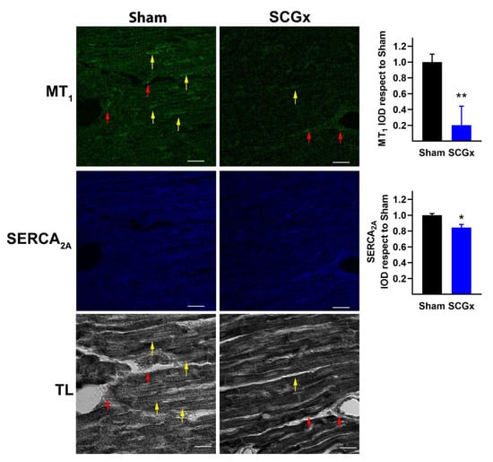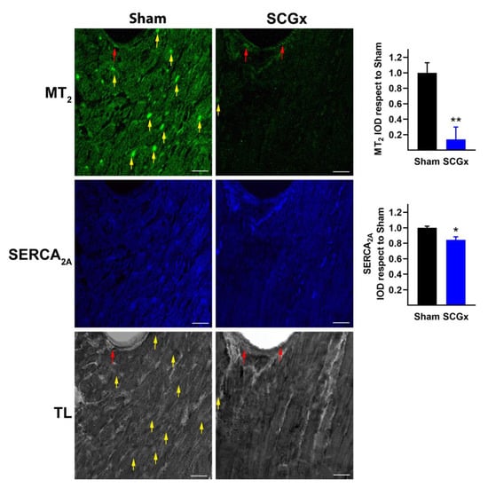 2.2. SCGx Reduced the Expression of Myocardial Melatonin Receptors and SERCA2A
