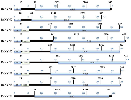 Nine GH10 domain-containing xylanase proteins were identified in the proteome predicted from the R. cerealis genome sequence (unpublished). None of GH11 family proteins were detected. These nine GH10proteins, designated as RcXYN1–RcXYN9, all contained the GH10 domain. In addition, RcXYN3–RcXYN8 contained a carbohydrate-binding module 1 (CBM1) domain (fungal-type cellulose-binding domain (FCBD) in Figure 1) (Table 1, Figure 1). Of these nine xylanases, RcXYN1–RcXYN4 were predicted to be secreted proteins based on the presence of a typical signal peptide and the absence of a transmembrane domain (TMHs) (Table 1). Using DNAMAN and SMART software, we found that the shortest xylanase protein, RcXYN2, consisted of 316 amino acid (aa) residues and the longest, RcXYN4, had 420 aa residues. Across RcXYN1–RcXYN9, the lengths of the GH10 domains ranged from 294 to 315 aa residues. The predicted molecular weights/isoelectric points (pI) of all the xylanase proteins ranged from 33.43 kD/6.43 to 45.09 kD/9.32, respectively (Table 1).