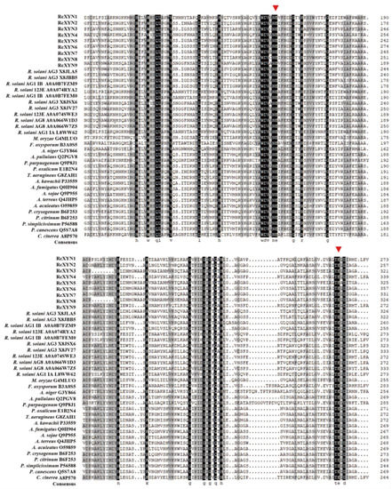Alignment of amino acid sequences of the active site regions of the 37 GH10 family xylanases. Among them, there were nine GH10 xylanases from R. cerealis, 11 GH10 xylanases from Rhizoctonia solani (123E, AG1 IA, AG1 IB, AG2-2IIIB AG3, AG8), and 17 GH10 xylanases from 17 other fungi (Magnaporthe oryzae, Fusarium oxysporum, Aspergillus niger, Aureobasidium pullulans, Penicillium purpurogenum, Penicillium oxalicum, Talaromyces aerugineus, Aspergillus kawachii, Aspergillus fumigatus, Aspergillus sojae, Aspergillus terreus, Aspergillus aculeatus, Penicillium crysogenum, Penicillium citrinum, Penicillium simplicissimum, Penicillium canescens, and Coprinopsis cinerea). Red triangles represent the activity sites of these enzymes.