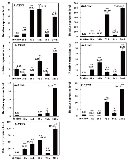 Expression patterns of the nine RcXYN genes in R. cerealis during the infection process of wheat stems. The R.cerealis Actin gene was used as an internal control to normalize cDNA. The expression of each xylanase gene was investigated during the infection process of wheat stems, including five different infection time points (18, 36, 72, 96, and 240 h after inoculation, hai) and compared to that of mycelia cultured in vitro. Error bars were calculated based on three replicates. * and ** indicate significant differences between R. cerealis-inoculated samples and in vitro samples (t-test; * p < 0.05 and ** p < 0.01).