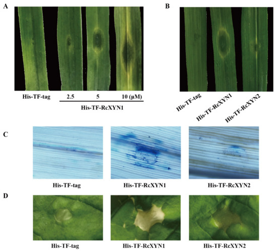 The necrosis and cell death induced by RcXYN1 in wheat and Nicotiana benthamiana leaves. (A) Wheat leaves 3 days post infiltration with the His-TF-RcXYN1 (2.5, 5, and 10 μM) and the His-TF-tag solution (5 μM) as control. (B) Wheat leaves 3 days post infiltration with the His-TF-RcXYN1 (5 μM) and His-TFRcXYN2 (5 μM). (C) Trypan blue staining of wheat leaves treated with His-TF-RcXYN1 (5 μM). Dead wheat leaf cells were stained by trypan blue. (D) N. benthamiana leaves infiltrated with His-TF-RcXYN1 (5 μM) and His-TF-RcXYN2 (5 μM).