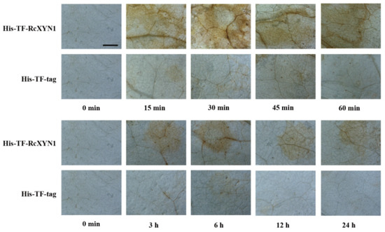 Detection of hydrogen peroxide (H2O2) in plants was conducted following a previously described method based on DAB staining [54]. Nicotiana benthamiana leaves treated by His-TF-RcXYN1 were sampled, and then immediately vacuum-infiltrated with a solution of 1 mg mL−1 DAB-HCl (pH 3.8) at 25 °C. These were placed under darkness for 8 h and subsequently boiled for 5 min in 95% ethanol [55].