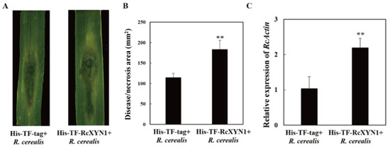 To determine the pathogenicity role of RcXYN1, liquid culture-derived mycelia of R. cerealis Rc207 were inoculated on the surface of wheat leaves pre-infiltrated with His-TF-RcXYN1 or His-TF. Subsequently, disease development was recorded over time by measuring water-soaked areas. At 2 dpi, water-soaked lesions were clearly observed in R. cerealis inoculated leaves pretreated with the His-TF-RcXYN1 or His-TF. However, disease development was faster and the disease lesions were larger in leaves pretreated with His-TF-RcXYN1 than those pretreated with His-TF control (Figure 8A). Statistical analyses also revealed a significant difference between His-TF-RcXYN1 and His-TF control (Figure 8A,B). Furthermore, RT-qPCR examination on the transcription of R. cerealis Actin in the infected plant tissues exhibited that the fungal biomass in the His-TF-RcXYN1-pretreated leaves was significantly greater than that in the His-TF-pretreated control leaves (Figure 8C).