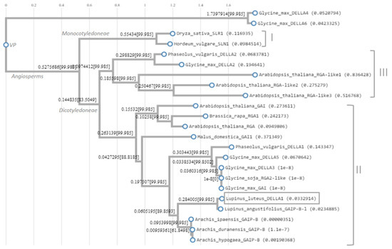 Maximum likelihood phylogenetic tree of 23 DELLAs derived from different plant species. Alignment and phylogenetic reconstructions were performed using Environment for Tree Exploration3 (ETE3) v3.1.1 program, as implemented on the GenomeNet. ML tree was inferred using PhyML v20160115 ran with model and parameters: --alpha e -f m --pinv e --nclasses 4 -o tlr --bootstrap -2. Branch supports are the Chi2-based parametric values returned by the approximate likelihood ratio test. Lupinus angustifolius GAIP-B-like (XP_019460121.1); Arachis hypogaea GAIP-B (XP_025691574.1); A. duranensis GAIP-B (XP_015957883.1); A. ipaensis GAIP-B (XP_016191184.1); Glycine max GAI (ALR99819.1); Glycine soja RGA2-like (XP_028232592.1); Malus domestica DELLA (ADW85805.1); Arabidopsis thaliana GAI (CAA75492.1); A. thaliana RGA (CAA72177.1); A. thaliana RGA-like1 (NP_176809.1); A. thaliana RGA-like2 (NP_186995.1); A. thaliana RGA-like3 (NP_197251.1); Oryza sativa DELLA (BAE96289.1); Hordeum vulgare SLN1 (AAL66734.1); Brassica rapa DELLA (AAX33297.1); G. max GAI/DELLA2 (XP_003552980.1); G. max GAI1/DELLA3 (NP_001240948.1); G. max SLR1/DELLA4 (XP_003528281.1); G. max GAI1/DELLA5 (XP_003531153.1); G. max DWARF8/DELLA6 (XP_003524001.1); Phaseolus vulgaris DELLA1 (BAF62636.1); P. vulgaris DELLA2 (BAF62637.1). VP—vascular plants.