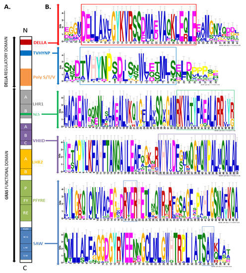 (A) Domain structure of a typical DELLA protein; (B) The motifs identified in the 23 DELLAs in different plant species. The overall height of each stack indicates the sequence conservation at that position, whereas the height of symbols within each stack reflects the relative frequency of the corresponding amino acid (MEME motif search tool).