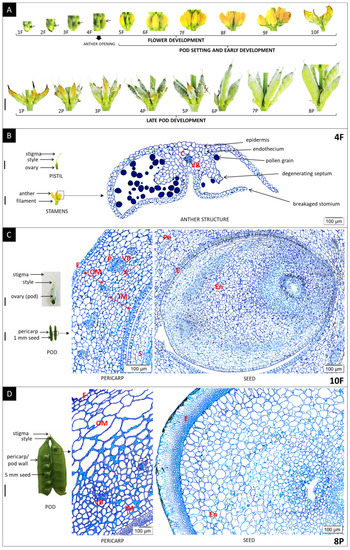 (A) Individual stages of flower (1F–10F) and pod development (5F–10F—pod setting and early development; 1P–8P—late pod development) in yellow lupine. After dehiscence program, anther opening occurred in the ~4F phase, followed by pollination and fertilization. (B,C,D) The anatomical structure of different generative organs (cross-sections). The anthers were collected from plants in the fourth stage of flower development (4F) (B). The pod wall/pericarp and seed were collected from plants in the tenth stage of flower development (10F) (C) and from plants in the eighth stage of pod development (8P) (D). Sections were stained with toluidine blue. C—connective, VB—vascular bundle, P—phloem, X—xylem, E—epidermis, OM—outer mesocarp, IM—inner mesocarp, Pe—pericarp, En—endosperm. Scale bars = 1 cm (A,D); 0.2 cm (B, each); 0.5 cm (C, each).