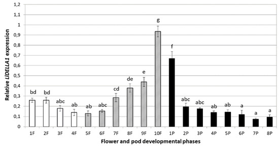 Expression profile of LlDELLA1 in different stages of generative organ development—flowers (1F–10F), early development of pods (5F–10F, marked in gray), and late development of pods (1P–8P, marked in black) in yellow lupine. The average value with ± SE of the three repetitions containing three replicates (n = 9) was used to draw the figure. The letters represent statistically significant differences at p < 0.05 (one-way ANOVA, followed by Tukey’s HSD test).