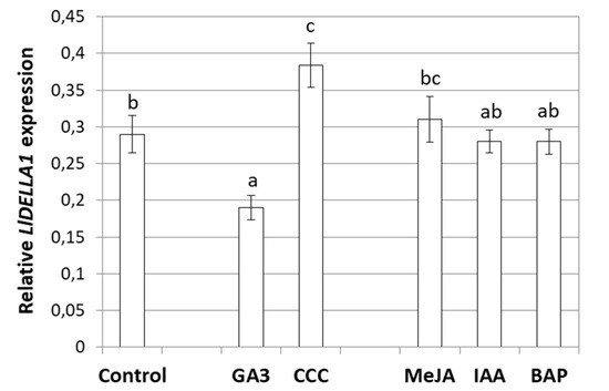 DELLAs encode proteins which integrate signaling pathways of different phytohormones. Moreover, a range of studies have shown that the level of DELLA transcripts changes under the influence of various phytohormones and their inhibitors [7,32,43]. In this paper, the LlDELLA1 expression patterns after GA3, GA biosynthesis inhibitor—chlorocholine chloride (CCC), methyl jasmonate (MeJA), indole-3-acetic acid (IAA), and 6-benzylaminopurine (BAP) treatments were analyzed (Figure 8). The obtained results showed that LlDELLA1 has a similar expression in response to MeJA, IAA, and BAP applications, comparing to the control variant. Statistically significant differences in LlDELLA1 transcriptional activity was noticed after GA3 and CCC treatment. LlDELLA1 transcripts were induced in response to the CCC application. In contrast, in response to the GA3 treatment, LlDELLA1 mRNA level was suppressed.