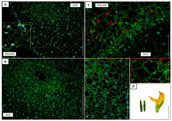Tissue and cellular localization of gibberellic acid (GA3) (A–C) in the early phase (10F; D) of pericarp and seed development in yellow lupine. Moderately low but visible GA3 level was observed in the pericarp (C,C’). In seeds, the phytohormone molecules were undetectable (A,A’,B,B’). The subfigures A', B' and C' are an enlargement of A, B and C, respectively. Red arrows indicate the localization of GA3. DAPI was used for nuclei staining. Scale bars: 100 µm (A,B), 50 µm (B’,C), 30 µm (C’), 25 µm (A’), 1 cm (D).