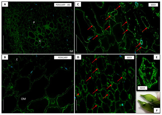 Tissue and cellular localization of gibberellic acid (GA3) (A–E) in the late phase (8P; F) of pericarp and seed development in yellow lupine. A higher level of GA3 was detected in the seeds (C,D,E) than in the pericarp (A,B). The green fluorescence signal was mainly observed near the walls of the seed cells (C,D) and only in some cells were the signal distributed throughout the cytoplasm (E). In pericarp, the presence of GA3 was not observable for epidermis (E), outer mesocarp (OM), and inner mesocarp (IM) cells, as well as conductive bundles (P—phloem, X—xylem) (A,B). Red arrows indicate the localization of GA3. DAPI was used for nuclei staining. Scale bars: 50 µm (A,B), 30 µm (C,D), 20 µm (E).