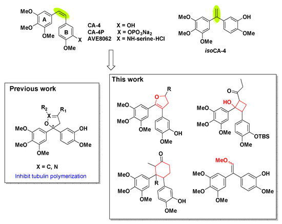 Isocombretastatin A-4 (isoCA-4, Figure 1), an unexpectedly synthesized isomer of CA-4 found by Alami [29], exhibited a very strong inhibition on cancer cell growth similar to that of CA-4. The synthetic method is simple without the control of cis-configuration [30,31]. The Alami group have completed plentiful studies on the modification of 1,1-diaryl double bond scaffold using naphthenic [32], naphthalene [33], arylchromenes [34], azaisoerianin [35], arylbenzoxepins [36], etc. In our previous works [37], dihydrofuran and dihydroisoxazole analogues of isoCA-4 were prepared through [3+2] reactions and could inhibit tubulin polymerization.