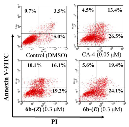 Apoptosis induction is characteristic of many known anticancer agents. To determine whether the inhibition of 6b-(Z) and 6b-(E) on cell growth was related to cell apoptosis, a flow cytometric analysis by staining cells with Annexin V-FITC and propidium iodide (PI) was performed on HepG-2 cells. The result showed that treatment with 0.05 µM CA-4 for 48 h induced 26.5% and 13.4% early and late apoptotic cells, respectively (Figure 3). Similar apoptosis induced by CA-4 has been reported previously [3]. After treatment with compounds 6b-(Z) and 6b-(E) at 0.3 µM, the early and late apoptosis rates were significantly increased from 5.0% and 3.5% (for control group) to 19.2% and 16.1% (for 6b-(Z) group), and 24.1% and 19.4% (for 6b-(E) group), respectively. The results indicated that both analogues could cause cellular apoptosis.