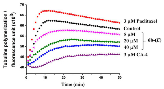 Furthermore, to investigate whether there is such an interaction of the active analogues with tubulin responsible for the activity, tubulin polymerization in vitro was measured for 50 min at 37 °C with paclitaxel as a promoting-assembly control and CA-4 as a depolymerization control. As shown in Figure 6, paclitaxel promoted the assembly of tubulin, while CA-4 inhibited it well. Compound 6b-(E) displayed an inhibition effect for tubulin polymerization in a dose-dependent manner. From these results, it could be concluded that 6b-(E) could inhibit the assembly of tubulin, and the cellular activities of 6b-(E) might be generated from this interaction with tubulin.
