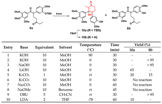 The condition optimization of Aldol condensation is shown in Scheme 3. At first, the reaction was performed with KOH in methanol under reflux, 8a was completely converted quickly, but there was no expected product 10a or 8b in entry 1. Then, three inorganic bases: KOH, NaOH and LiOH (entry 2-4) were selected and methanol was employed as the solvent at 0 °C. After the three bases were added, the reaction occurred immediately, and 10a was obtained in the beginning period. However, 10 min later, the reactions of KOH and NaOH began to generate 8b. After another 20 min, all 10a and 8a were turned into 8b. However, the reaction of LiOH (entry 4) started to generate 8b after 30 min, while the conversion yield of 10a is 65%. Under the action of K2CO3 (1 eq, entry 5), 8a could rapidly generate a mixture of 10a, 8b and a little deprotected product of 10a at room temperature. Yet, when the temperature fell to 0 °C, 8a was completely unreactive even increasing the equivalent of K2CO3 to 10 eq (entry 6). NaOMe also could not make 8a react in solvent of benzene in entry 8. In organic bases, 1,8-diazabicyclo[5.4.0]undec-7-ene (DBU) could make 8a to turn into 8b within 30 min at room temperature, and lithium diisopropylamide (LDA) could give a 10% yield of 10a at −78 °C, in entry 9 and 10, respectively. To sum up, LiOH, 0 °C, and 30 min were the optimized conditions with a conversion yield of 65% for 10a. After 10a was deprotected by TBAF, a cyclohexane-based CA-4 analogue 10b was obtained (Scheme 3).
