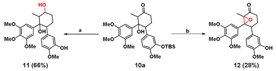 In order to enhance the polarity and water solubility of 10b, carbonyl group of 10a was reduced by sodium borohydride (NaBH4) to a HO group (Scheme 4). After deprotection of the TBS group by TBAF, 11 was obtained in two steps with a 66% yield. Moreover, LiHMDS was employed to remove the hydroxyl hydrogen of 10a, and then p-toluenesulfonyl chloride (TsCl) and the DMAP-Et3N system were used to eliminate the sulfonyl group. Finally, the TBS group was deprotected by TBAF to give another cyclohexane analogue 12 (Scheme 4). The total yield of the three steps was 28%. It was noted that 12 was unable to react under the action of NaBH4 to afford 11.