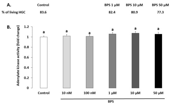 The BPS effects on cell viability was investigated through both HGC live/dead staining (Figure 1A) and adenylate kinase assay in spent media (Figure 1B) after 48-h treatment. The living HGC rate evaluated using live/dead staining was 83.6% for the control condition and was not affected by 1, 10 or 50 µM BPS (82.4%, p = 0.191; 80.9%, p = 0.91; and 77.3%, p = 0.323, respectively). HGC viability was also assessed by measuring adenylate kinase activity in spent HGC culture media (Figure 1B). There was no significant difference in adenylate kinase activity between the control and any BPS condition (p = 0.182).