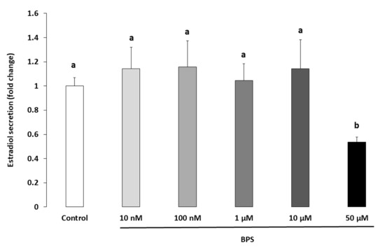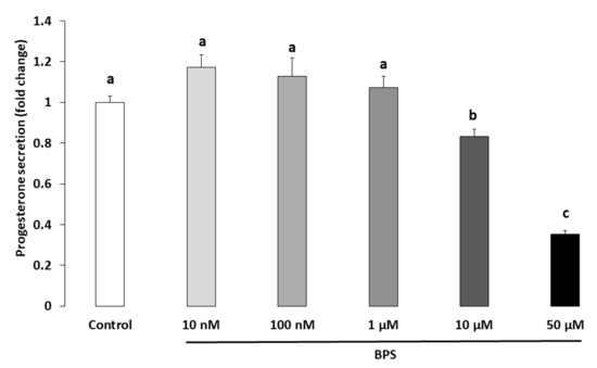 We observed a 16% and 64% decrease in progesterone after 10 and 50 µM BPS treatment, respectively. We then compared the BPS effects reported in the present study with BPA effects reported in the literature in terms of their intensity. A study in HGC reported a 20% and 75% decrease in progesterone secretion after 2 and 20 µg/mL (8.8 and 88 µM) BPA treatment, respectively [32]. We found a 46% decrease in oestradiol secretion after 50 µM BPS treatment, while Mansur et. al reported a 60% decrease after 88 µM BPA treatment [32]. In both studies, treatment lasted for 48 h. These data suggest that BPS and BPA have a similar effect on human steroidogenesis in terms of intensity.