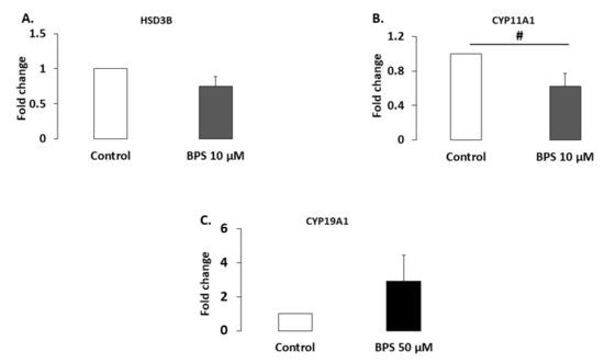 HSD3B1 and CYP11A1 are steroidogenic enzymes involved in progesterone synthesis. Their protein expression levels were analysed using western blotting in HGC treated with 10 µM BPS, a concentration that decreased progesterone secretion (Figure 3). Ten µM of BPS treatment showed a tendency to decrease CYP11A1 expression levels (37.7%; p = 0.0947; Figure 5B), but it did not affect HSD3B1 expression (p = 0.124; Figure 5A). CYP19A1 is a steroidogenic enzyme involved in oestradiol secretion. Its expression level was therefore investigated in HGC treated with 50 µM BPS, the concentration that reduced oestradiol secretion. This treatment did not affect CYP19A1 expression (p = 0.564; Figure 5C).