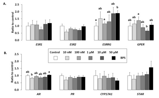 Effect of BPS on HGC gene expression. The expression of six hormonal receptors (oestrogen receptors (A): oestrogen receptor 1 [ESR1], oestrogen receptor 2 [ESR2], Oestrogen-related receptor γ [ESRRG] and G protein-coupled oestrogen receptor [GPER] and (B) androgen receptor [AR], progesterone receptor [PR]), and two genes involved in steroidogenesis (B: CYP17A1 and StAR), was determined in HGC after 48-h culture in complemented serum-free McCoy’s 5A media in the presence or absence of BPS (10 nM, 100 nM, 1 µM, 10 µM or 50 µM). Total messenger RNA (mRNA) was extracted from HGC and reverse transcribed, and real-time polymerase chain reaction (qPCR) was performed. The geometric mean of two housekeeping genes (Glyceraldehyde-3-phosphate dehydrogenase [GAPDH] and ribosomal protein L19 [RPL19]) was used to normalise gene expression. The results are expressed as mean ± standard error of the mean (SEM) of six independent cultures and normalised to the mean of control condition. No letter in common indicates a significant difference (p < 0.05).