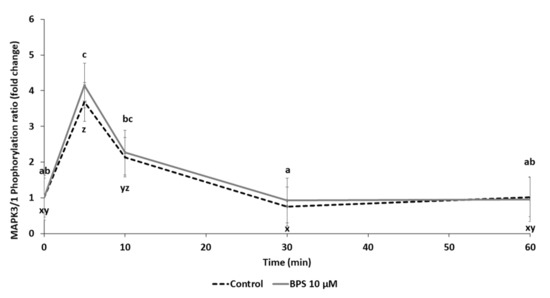 MAPK3/1 signalling pathway was investigated after 5, 10, 30 and 60 min treatment in the presence or absence of 10µM BPS (Figure 7). In control cells (HGC treated with medium only), a transient 3.7-fold increase in MAPK3/1 phosphorylation was observed after 5 min (p < 0.0001). There was a similar 4.1-fold increase in MAPK3/1 phosphorylation after 5 min with 10 µM BPS. There was no difference in MAPK3/1 phosphorylation between 10 µM BPS and control treatments.