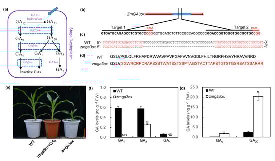 The GA3ox enzymes participate in the synthesis of bioactive GAs and catalyze the conversion of GA9 to bioactive GA4 and GA20 to GA1 and GA3 (Figure 1a). In order to verify the role of GAs in response to N supply in maize, the knockout mutants were generated using a type II CRISPR-Cas9 system [29]. A knockout mutant named zmga3ox was obtained, which conferred a 34-bp deletion causing a frameshift in ZmGA3ox (Figure 1b–d). Compared to the wild-type plant, the expression level of ZmGA3ox was hardly detected in the shoots and roots of zmga3ox plant (Figure S1). Meanwhile, the zmga3ox plant displayed growth inhibition, and exogenous GA3 could restore normal growth (Figure 1e). The concentrations of GA1, GA3, and GA4 in zmga3ox plant were significantly lower than those in wild-type plants (Figure 1f). Also, the zmga3ox plant had greater levels of GA9 and GA20 compared to the wild-type (Figure 1g). These results suggest that zmga3ox is an endogenous GA-defective mutant.