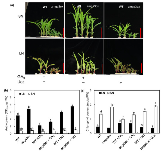 The anthocyanin accumulation and chlorophyll content in zmga3ox leaves under LN or SN condition. (a) Appearance of the GA3 or Ucz-treated wild-type and zmga3ox leaves at 7 d after LN or SN treatment. Bar = 10 cm. (b) The content of anthocyanin in zmga3ox shoots treated with GA3 or Ucz at 7 d after LN or SN treatment. Values were the means ± SD (n = 3). (c) The content of chlorophyll in zmga3ox shoots treated with GA3 or Ucz at 7 d after LN or SN treatment. Values were the means ± SD (n = 3). Different letters indicated significant difference calculated by Fisher’s LSD (p < 0.05).