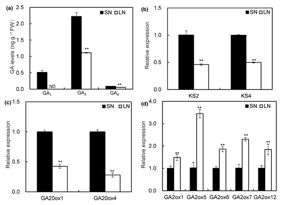 In order to understand the role of GAs in maize corresponding to NO3− supply, the content of GA1, GA3, and GA4 was determined by using the HPLC–MS/MS method. LN significantly decreased the content of GA1, GA3, and GA4 in roots as compared to SN (Figure 3a). The GA1 content could not be detected in the roots under the LN condition, while the GA3 and GA4 levels were lower under LN condition than those under the SN condition. The expression levels of ent-kaurene synthase genes ZmKS2 and ZmKS4 in GA biosynthesis pathway were significantly downregulated by LN in comparison to SN (Figure 3b). Similarly, LN significantly decreased the expression levels of ZmGA20ox1 and ZmGA20ox4 (Figure 3c). LN enhanced the expression levels of catabolic genes ZmGA2ox1, ZmGA2ox5, ZmGA2ox6, ZmGA2ox7, and ZmGA2ox12 (Figure 3d). The GA3 contents, as well as the expression of genes encoding enzymes of GA metabolism, were also determined in the zmga3ox mutant. As shown in Figure S3, the levels of GA3 were less under LN condition than those under the SN condition (Figure S3a). LN significantly down-regulated the expression levels of GA biosynthetic enzyme genes ZmKS2, ZmKS4, ZmGA20ox1, and ZmGA20ox4 (Figure S3b,c). Inversely, LN enhanced the expression levels of catabolic enzyme genes ZmGA2ox1, ZmGA2ox5, ZmGA2ox6, ZmGA2ox7, and ZmGA2ox12 (Figure S3d). The results indicated that LN caused a reduction in the bioactive GAS levels in roots by regulating the transcripts encoding GA 20-oxidases and GA 2-oxidases.