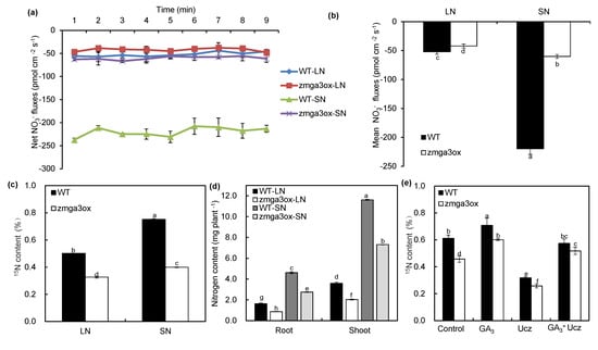 Nitrate uptake and allocation in zmga3ox plants under LN and SN conditions. (a–b) The net NO3− flux (a), and the mean NO3− flux (b) along the maturation zone of wild-type and zmga3ox primary root. Values were the means ± SD (n = 7). (c) The 15N content after 10 min 15N tracing assay in wild-type and zmga3ox plants; (d) total N content per plant in shoots and roots of wild-type and zmga3ox plants; (e) the 15N content in wild-type and zmga3ox seedlings treated with GA3 and/or uniconazole (Ucz). (c–e) Values were the means ± SD (n = 3). Different letters indicated significant difference calculated by Fisher’s LSD (p < 0.05).