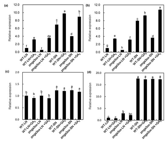 Effects of exogenous GA3 on the expression levels of ZmNRT2.1 (a), ZmNRT2.2 (b), ZmNPF6.3a (c), and ZmNPF6.3b (d) in wild-type and zmga3ox roots under LN and SN conditions. The roots were harvested at 72 h after GA3 treatment under LN and SN conditions. Values were the means ± SD (n = 3). Different letters indicated significant difference calculated by Fishe’s LSD (p < 0.05).