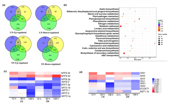 The DEGs involved in NO3− uptake and metabolism. (a) Venn diagrams showed the up- and downregulated significantly differentially expressed genes (DEGs) identified by RNA-seq in the wild-type and zmga3ox roots at 12, 60, and 108 h after LN and SN treatments, respectively; (b) list of the top 20 significant enriched KEGG pathway of significantly regulated DEGs. (c,d) Heatmap showed the DEGs involved in NO3− uptake and transport (c), N assimilation and NH4+ uptake (d). Genes annotated by MaizeGDB gene model were shown with gene name. Different expression levels were shown as log2FC, blue for downregulation and red for upregulation, as shown in color bar.