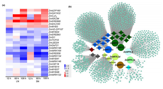 The transcriptional control of NO3− uptake is well-documented over the past decade, in which transcription factors (TFs) play an important regulatory role [30]. The RNA-seq analysis revealed that a total of 287 important DEGs were identified as TFs (Table S6). To predict the targets of transcriptional regulation, the TF-binding sites were predicted from the putative promoter sequences (2 kb upstream from the transcriptional start site) of the nine identified nitrate transporter genes. As shown in Figure 8a and Table S7, 25 TFs were predicted to be involved in the regulation of nitrate transporter genes. The number of binding sites of the MYB, WRKY, and ERF families was the greatest, followed by the LBD, TCP, and bZIP family TFs.