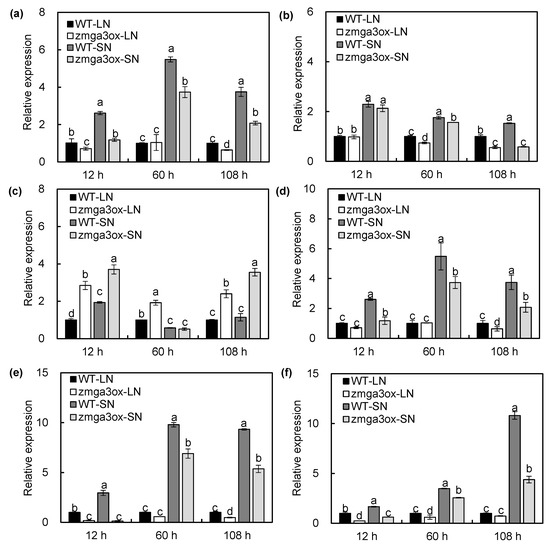 The expression levels of ZmTCP33 (a), ZmLBD24 (b), ZmBbZIP160 (c), ZmWRKY34 (d), ZmEREB93 (e), and ZmMYB41 (f) in wild-type and zmga3ox roots under LN and SN conditions. Roots were harvested at 12, 60, and 108 h after LN and SN treatments. Values were the means ± SD (n = 3). Different letters indicated significant difference between the wild-type and zmga3ox plants at the same time point calculated by Fisher’s LSD (p < 0.05).