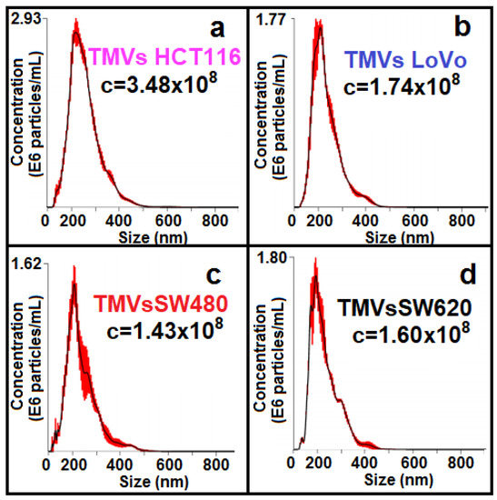 Nanoparticle tracking analysis of size distribution and concentrations (number EVs/mL) of TMVs collected from HCT116 (a), LoVo (b), SW480 (c), and SW620 (d) cell lines.