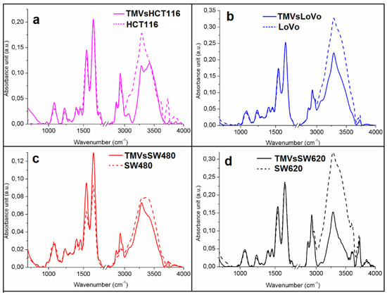 Offset FTIR spectra of: (a) HCT116; (b) LoVo; (c) SW480 and (d) SW620 cell lines (dashed lines) and of: (a) TMVHCT116; (b) TMVLoVo; (c) TMVSW480 and (d) TMVSW620 (full lines).